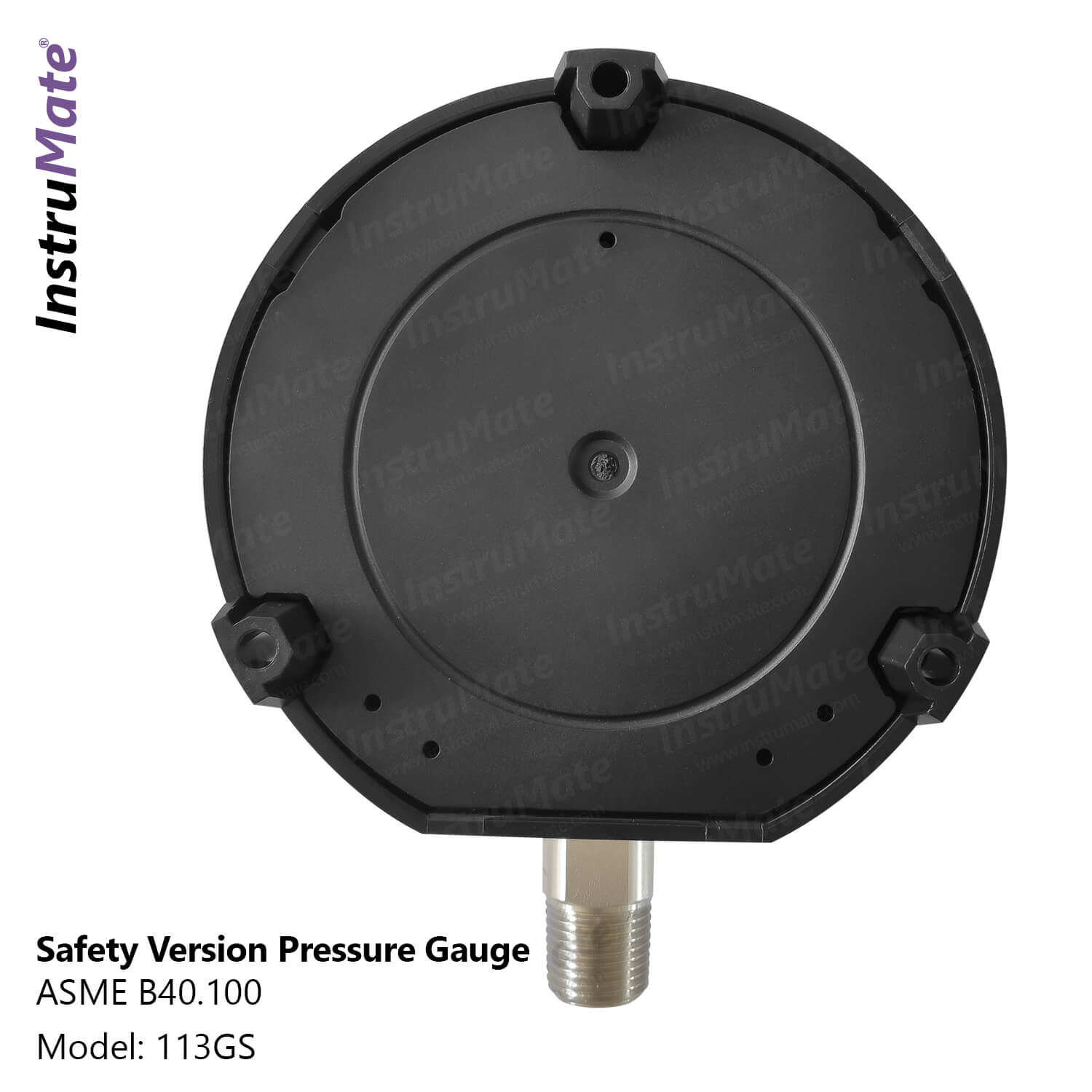 InstruMate 113GS pressure gauge is offered with micro-adjustable pointer in standard version. This high safety pressure gauge is made in compliance with ASME B 40.100 standard. The solid front pressure gauge makes it the best choice for applications requiring safety measures for operator. In case of burst out of the bourdon tube, the blow out disk will open and media will be