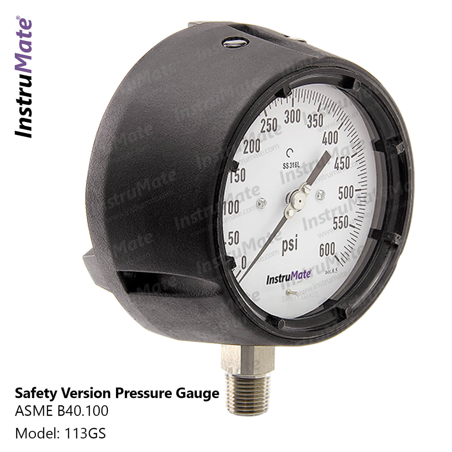 The wetted parts of this accurate and durable safety pressure gauge is SS316. InstruMate 113GS is offered with filling option.