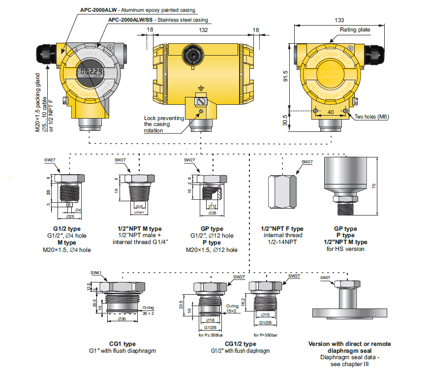 2000ALW are described on page I/ 3 of catalogue. Pressure transmitters APC-2000ALW MID are produced only with nominal ranges according to the table. Transmitter due to factory blockade of transmitter’s configuration cannot be configurable by user. Electrical connection of the transmitter is according to drawing on page I/ 3. Available are only terminals SIGNAL + and SIGNAL -.