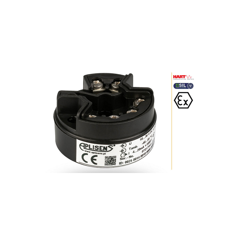 The temperature transmitter LI-24G is applicable to converting resistance of temperature or voltage of thermocouple sensor to standard current signal 4-20mA. The transmitter has two separate measuring channels enabling measurement of temperature difference, averange, averange with redundancy, max or min temperature. Transmitter has compensation of ambient temparature influence and compensation of thermocouple cold junction using internal/external (Pt100) sensor or constant temperature. Most of parameters such as: sensor type, measuring range, current alarm signal when electric circuit is broken, output characteristic correction, user characteristic (60 points) are programmed using PC with HART/USB converter and Raport 2 configuration software. For request Aplisens can set temperature transmitter parameters like measuring range, type of sensor. Their values are printed on label.