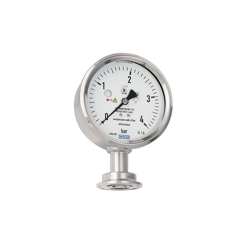 The flush welded diaphragm element in conjunction with the aseptic process connections enables a dead-space free connection to the process. The independent pressure display, needing no external power, finds applications with the processing and transport of high-quality and critical media, for example on portable tanks.