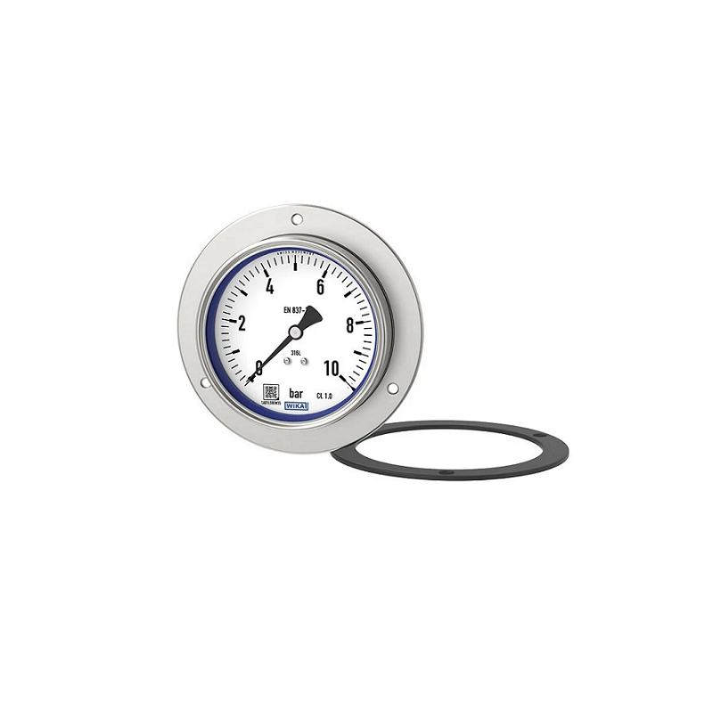 Stainless steel, all welded mounting ring, with blow-out device at case circumference, o‘clock (NS 63) and on the back of the case (NS 100), scale ranges ≤ 0 ... 16 bar with compensating valve to vent case