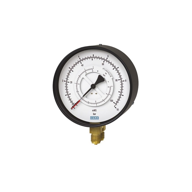 The standard version is designed with two pointers and a gauge pressure scale. The pointer for the minus connection is connected to an additional moving dial. On the scale of the moving dial, the differential pressure (±50% of the main scale's full scale value) can be read directly.