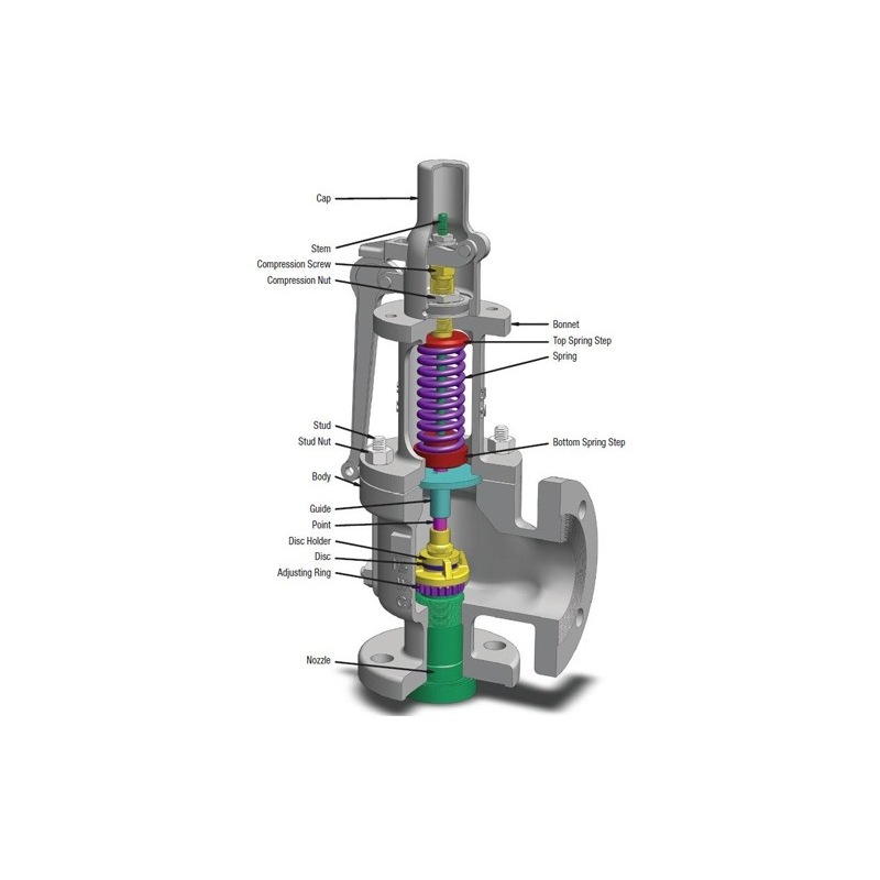 Nắp chụp bảo vệ: Là bộ phận lắp ghép liền với thân van để tạo lên một bộ phận kín lưu chất, hạn chế tối đa tình trạng rò rỉ. Với loại van gián tiếp sẽ có các núm điều chỉnh được gắn phía trên để điều chỉnh nếu áp suất vượt qua định mức ban đầu.